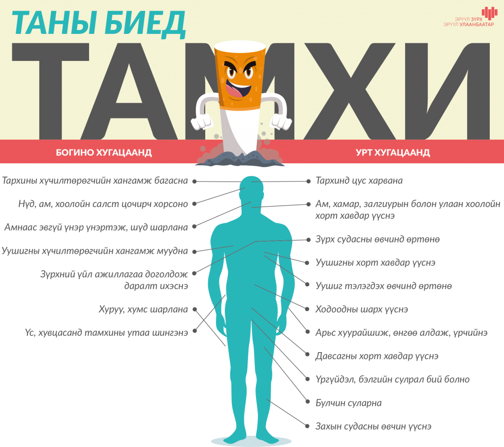 Мөн тамхин дахь никотин-алкалоид нь хэдхэн секундын дотор төв мэдрэлийн тогтолцоонд нэвтрэн ордог. Никотины нөлөөгөөр цусны даралт ихсэх, зүрхний хэмнэл түргэсэж улмаар зүрх амархан эцэж цуцдаг. Цаашид зүрх ачаалалдаа дасан зохицуохын тулд томорч эхэлдэг. Нөгөө талаас тамхин дахь хорт бодисууд судсыг гэмээснээс судасны хананд өөх тос хуримтлагдаж, зарим жижиг судас бөглөрч, судас хатуурна. Ингээд л судас амархан хагарах аюултай болдог. Ингэснээр тархины цус харвалт, зүрх бүхэлдээ буюу зүрхний аль нэг хэсэг цагаас урьтаж агших, зүрхний цохилт гэнэт олширох, зүрхний шигдээс өвчин үүснэ. Иймд Монгол улс хүн амын тархинд цус харвалтын тохиолдлоор дэлхийд НЭГДҮГЭЭР-т бичигдээд байна.